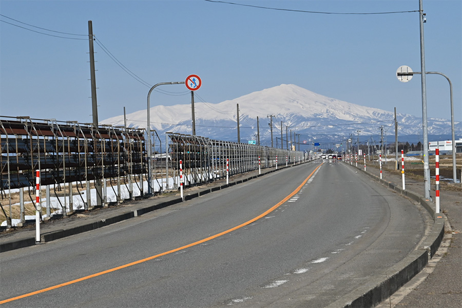 春を待つ鳥海山(2,236m)と役目を終えた防雪柵 撮影:佐藤英二