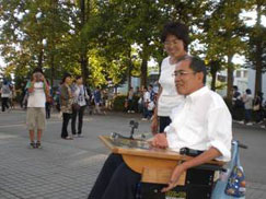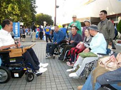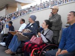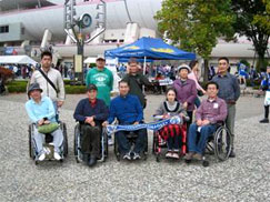頸損部の今年度最大のイベントである、『サッカーJ1観戦』は、秋晴れの10月3日(土曜日)にNDソフトスタジアム山形(天童市)で実施されました。阿部憲史頸損部長の呼びかけに会員7名と介助者9名が、現在15位、われらがモンテディオ山形のJ1定着を信じて観戦に臨みました。 スタジアム周辺には、県内外から訪れた8000人を超すサポーターらが、グッズを買い求めたり、地元グルメに舌鼓を打ちながらキックオフまでの時間を思い思いに楽しんでいました。