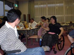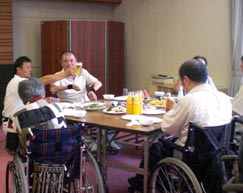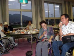 映画鑑賞終了後はお待ちかねの《焼肉&ビヤガーデン》。 今年は付き添い介助者も含み44名の参加があり、【東紅苑】の大江所長始め、職員総出で準備してくれたバーべキューと生ビールをおいしく頂きました。