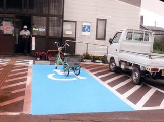 その後、福島県の『まちづくり条例』の『施設整備マニュアル』に「車いす使用者用駐車施設であることを明確にするため、車体用スペースの路面にカラー塗装することが望ましい」と記載されましたが《青色》とは記載されず現在に至っています。