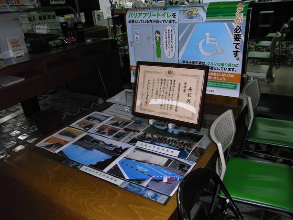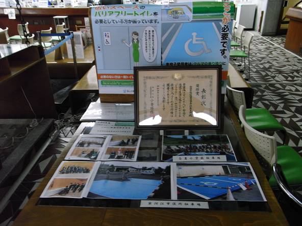 昨年末に受賞し県庁に1ヶ月、山形市役所に1ヶ月展示した『令和4年度バリアフリー・ユニバーサルデザイン推進功労者』の賞状と盾を4月から寒河江市ハートフルセンターに展示していましたが、4月28日から寒河江市役所正面ロビーに展示頂いて居ます。