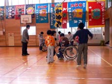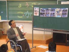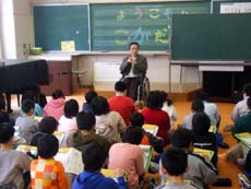その一環で平成20年2月28日木曜日 鶴岡市立小堅小学校3,4年生(2~3時間目 9:30~11:20まで31名)を対象に実施された《福祉学習》に社会福祉協議会職員の大戸さん、ボランティアセンターの幸田さん、福祉学習サポーターの白幡さんと一緒に講師として招かれ、自身の生活体験の話や、3人の人たちと一緒に子供たちに車椅子体験の指導をしました。