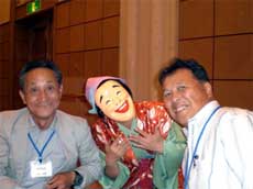 大会全日程終了後、同じ会場で交流懇親会が賑やかな太鼓演奏で幕開けし、おどけたお面踊りや、若いゲスト歌手二人による歌などで盛り上がり楽しい時を過しました。