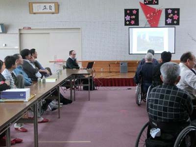 先生は褥瘡治療の専門医で、『脊髄損傷者の経年的骨格変化と車椅子乗車姿勢』について研究されており、平成24年から何名かの会員が研究に協力し、今回はその結果についてパワーポイントを使っての講演でした。