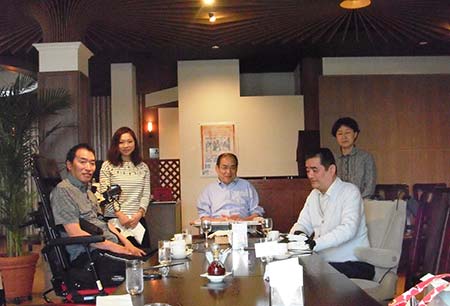 メンバーを紹介します。阿部憲史頚損部長(山形市)、中島幸生支部長(大蔵村)、山田沙樹さん(寒河江市)、伊藤進一さん(最上町)、松浦俊一さん(鶴岡市)、松田義文さん(山形市)、押切圭子(高畠町)、そしてゲストに地元寒河江市の後藤義孝さんと柴田弘好さんが来てくださり、ご家族、介助者含めて15名の会合となりました。