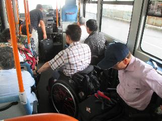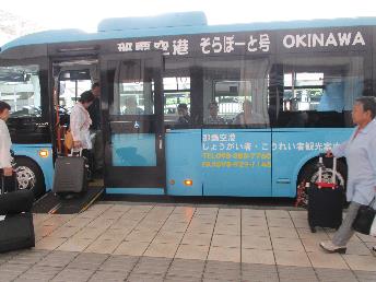 沖縄県支部で準備したノンステップバスで大会会場へ。