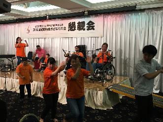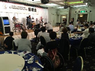 18時半から行われた交流懇親会は、会場内を車いすで自由に動けない程多くの参加者が、泡盛利き酒や障害者自身での演奏会などのアトラクションを見ながら楽しみました。 (文責 小林)
