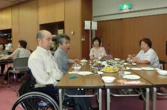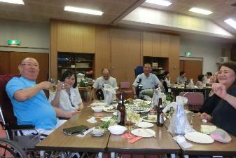 その後、東紅苑職員の方々が焼いてくれた肉や野菜の準備が整い、いつもより少し早い4時半頃から羽角副支部長の進行、中島支部長の挨拶でビヤガーデンが始まりました。
