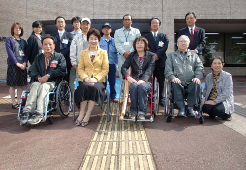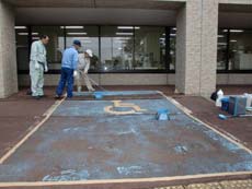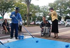 知事は同日、ほのぼのトークで同市内を訪問し、これに合わせて車椅子利用者でつくる全国脊髄損傷者連合会山形県支部(小林光雄支部長)が同庁舎の青色駐車帯の塗り替えを実施。知事に「障害者専用駐車スペースの普及について現状や課題を聞いて欲しい」と訴えた。