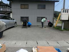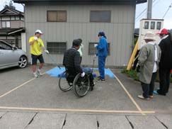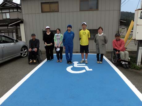 5月22日、鶴岡第5中学校3学年福祉学習で羽黒福祉センターに来た奥山くん、柿崎くん、福祉学習サポーターの安藤さん、センター職員2名と会員勝木さんと私の7名で羽黒山参詣道入口近く『御食事処 いしい』さんに青色駐車場を作ってきました。
