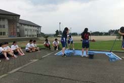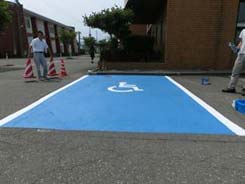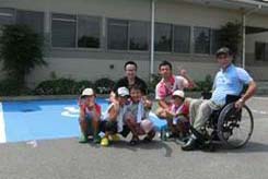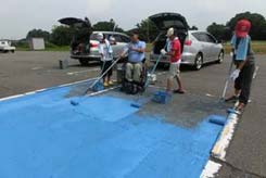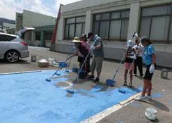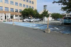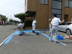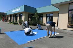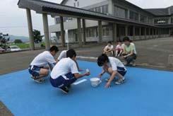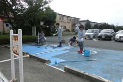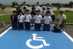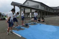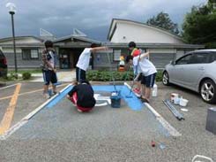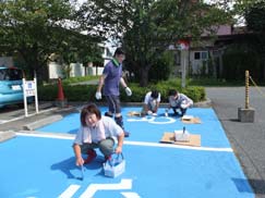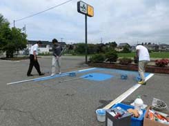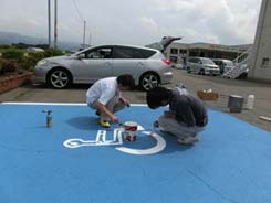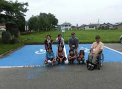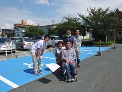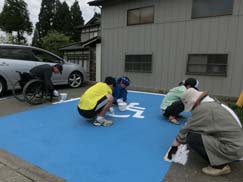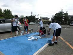 ハートビル法改正直前に竣工した櫛引中学校には、青色駐車場がありませんでしたが、生徒会長佐藤涼君の声がけで8月9日、生徒会役員で駐車場作りをしました。