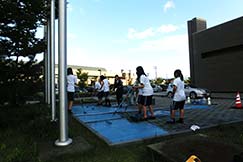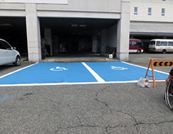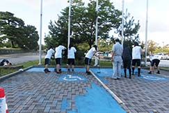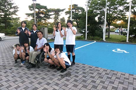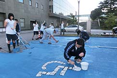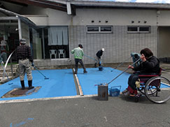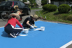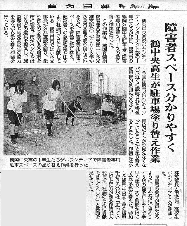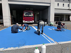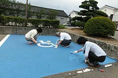 鶴岡市福祉課より塗装材の支給を受け、市の施設を管理している職員などと塗り替えを行っていますが、公益ホール前にあるこの青色駐車場は直接関係する職員がいない為、鶴岡中央高校ボランティア部10名の皆さんに、授業の終わった後手伝って頂き実施しました。