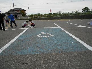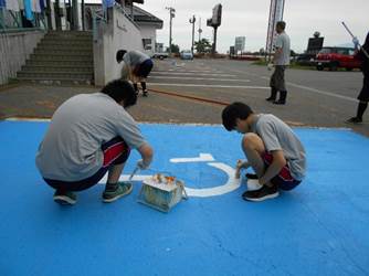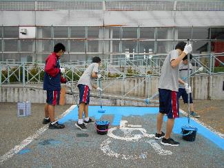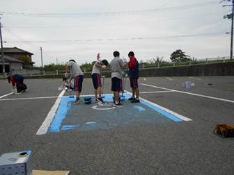 私は青色担当。男子生徒4人で2ヶ所の駐車場を青色に再塗装しました。