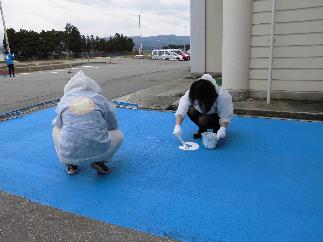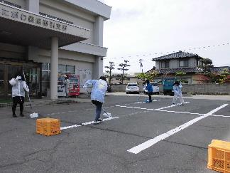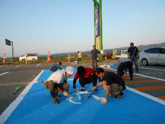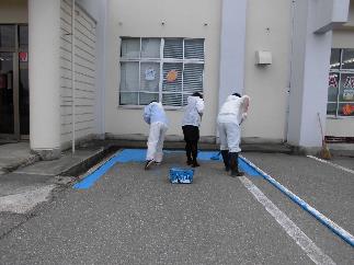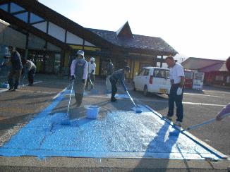 青色が極めて薄くなった今年、伊藤支所長に、より施設に近い場所への移設も含みお願いしたところ、快諾頂き、職員8名で施設内駐車場ラインの乗り直しと共に塗装頂きました。