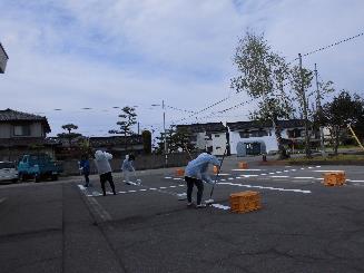 今年も、澤川社長始め、10名位の組合員の方々が夕方5時から作業を開始し、3台の青色駐車場を含み、広い施設内の白線や、駐車禁止を表示する黄色線の塗装を1時間半余りで完成させました。