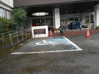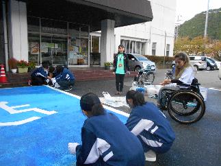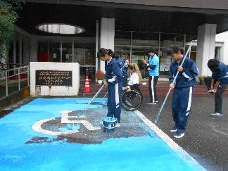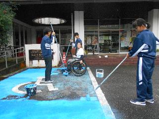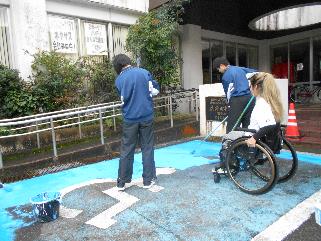 林業センターに戻り、車いすマークとラインの塗装。