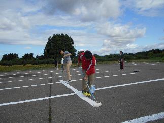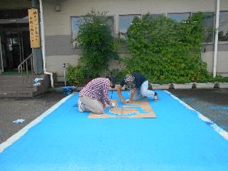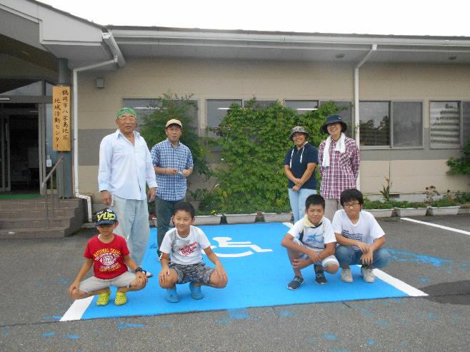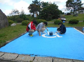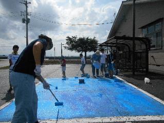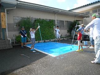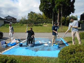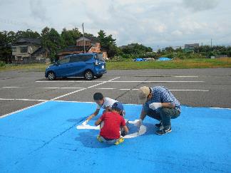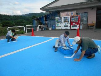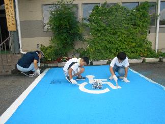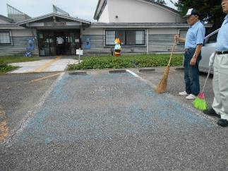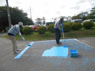 この日は活動センター職員と公民館長・ボランティアで参加してくれた子供たちとその父兄で2台分の青色駐車場の塗り替えを行いました。