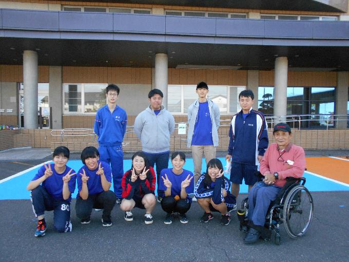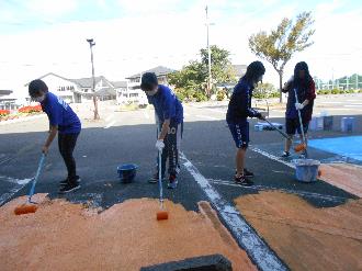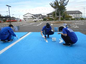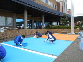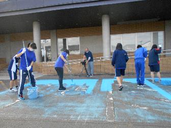今年最後の活動として鶴岡市櫛引庁舎正面を塗装しました。塗装活動に参加されたのは地元高校生ボランティアサークル『ノーサイド』の9名。10時から12時過ぎまで、全面青色2台、ダブルスペース分2台を約2時間掛けてきれいに仕上げました。