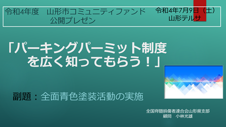 2回の『全脊連総会山形県大会』や、昨年行われた『車椅子使用者用駐車施設のあり方に関するシンポジウム』に協力頂いて居た山形市の小野仁さんから《令和4年度山形市コミュニティファンド》への申し込みの支援を頂き、7月9日(土)公開プレゼンテーションを行いました。