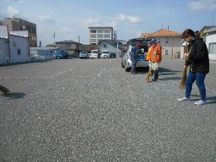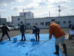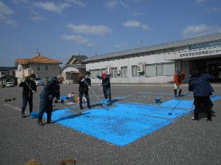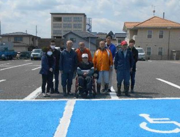 この施設には3団体が入居されていて、各団体から8名の方が参加され2台分の青色駐車場と一般駐車場すべての白線塗装を約2時間で仕上げました。