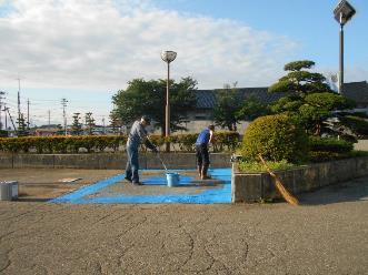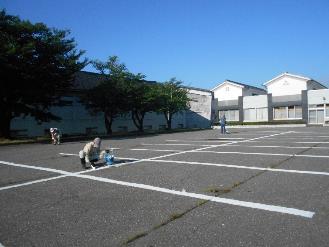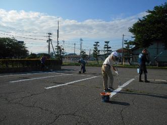 長い時間で青色駐車場だけでなく、一般駐車場のラインも消えかかることから定期的に再塗装していましたが、この日も早朝6時から事務局長の小池さん始め地区役員の方7名が約2時間かけて再塗装しました。