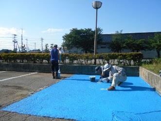 2年くらい前から青色駐車場が薄くなり、再塗装を要望していましたがようやく梅雨明け直後、この日の塗装となりました。