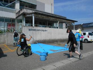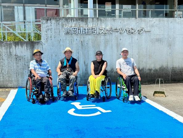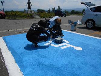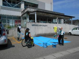 この日はすぐ近くにお住まいの渋谷さん、櫛引スポーツクラブに所属し月に何度も駐車場にお世話になって居る勝木さん、押切(鉄)さん、4月から支部会員になり櫛引スポーツクラブの運営委員でもある佐藤さんの4人にも応援頂き、スポーツクラブ職員3名と共に、1台分を新設し3台分の青色塗装とライン塗装を行いました。
