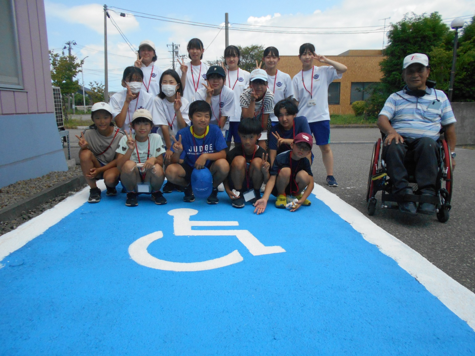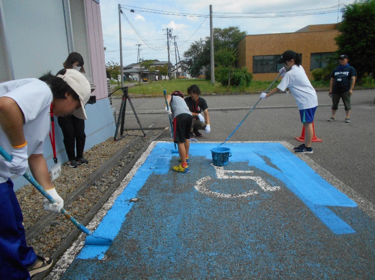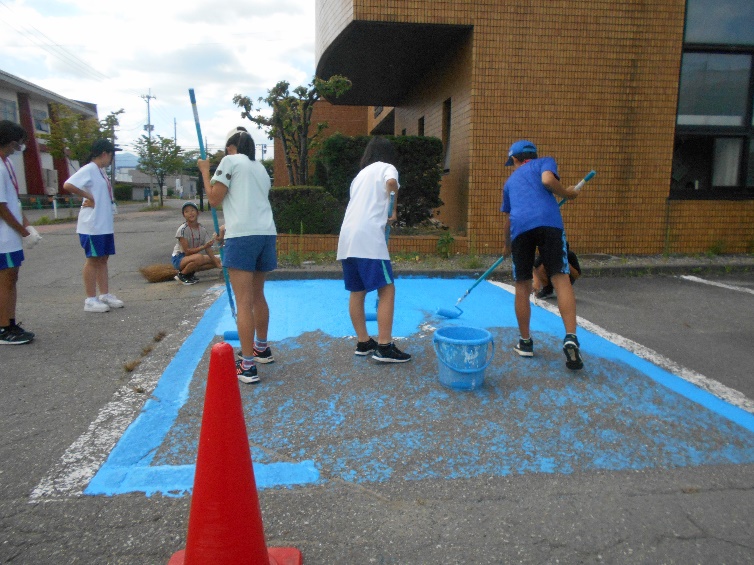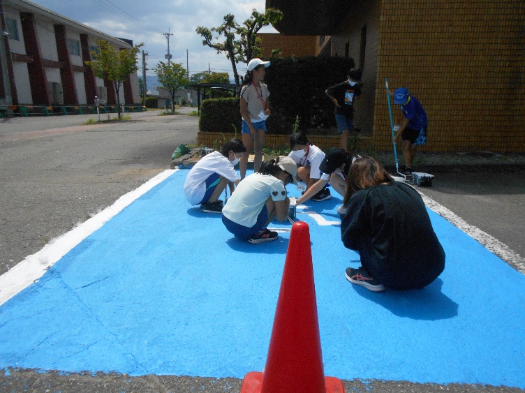 今年は例年以上に暑さが厳しい中での開催でしたが、参加した小学生6人、中学生9人は2班に分かれ2か所の駐車場の全面青色の塗り替えを行いました。