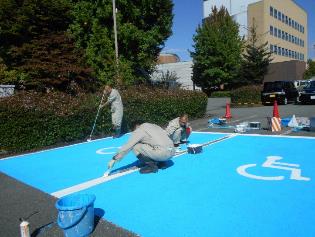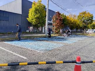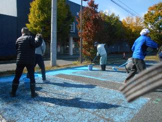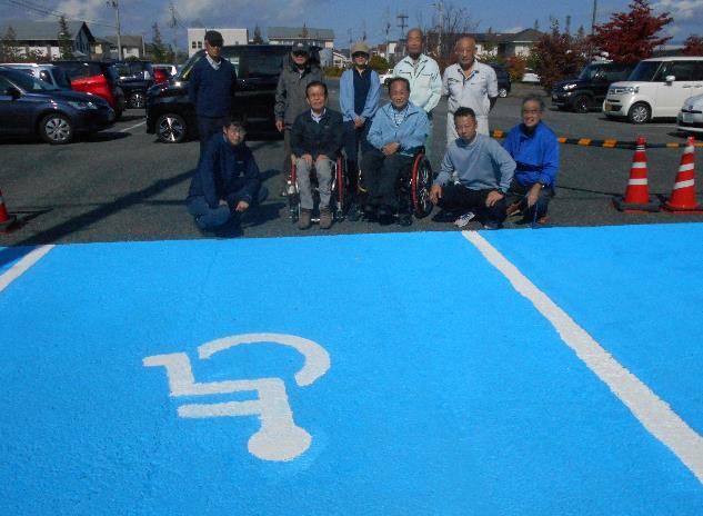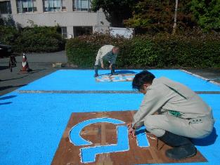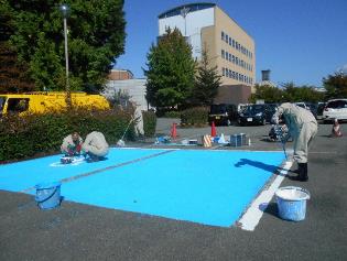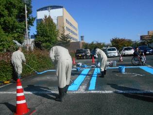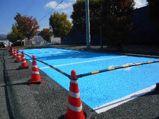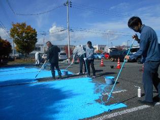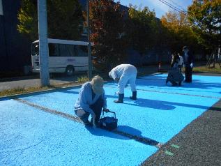 昨年実施した《山形市福祉センター》隣にある施設で、ほとんど消えかかっていた全面青色駐車場でしたので9月中旬再塗装のお願いに行き、この日の実施となりました。