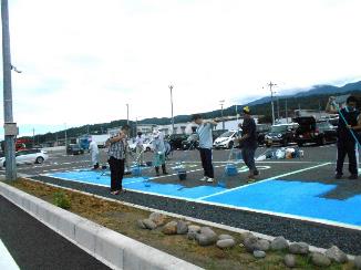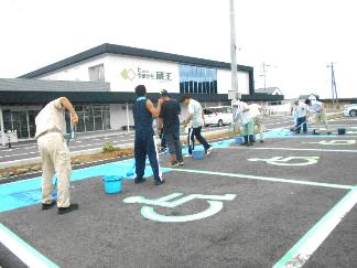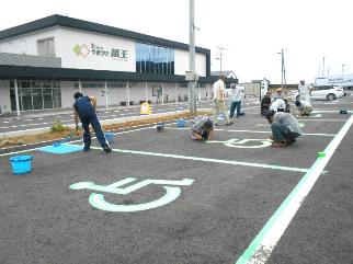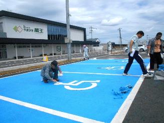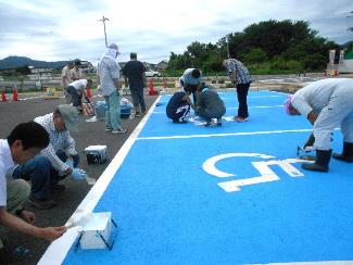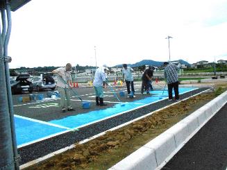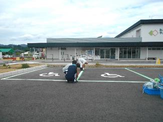 9時半から始まった作業はラインと車いすマークのテープでの養生。
