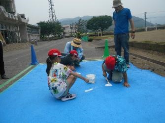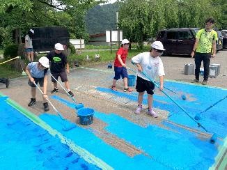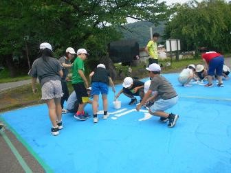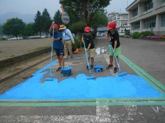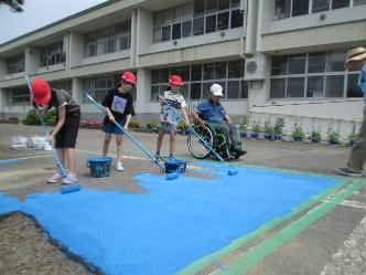 まず初めに小学校正面駐車場を全員が交代で塗装体験をしてみました。
