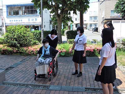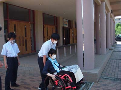 終盤は教室を飛び出して、車いすの介助法を学び合いました。